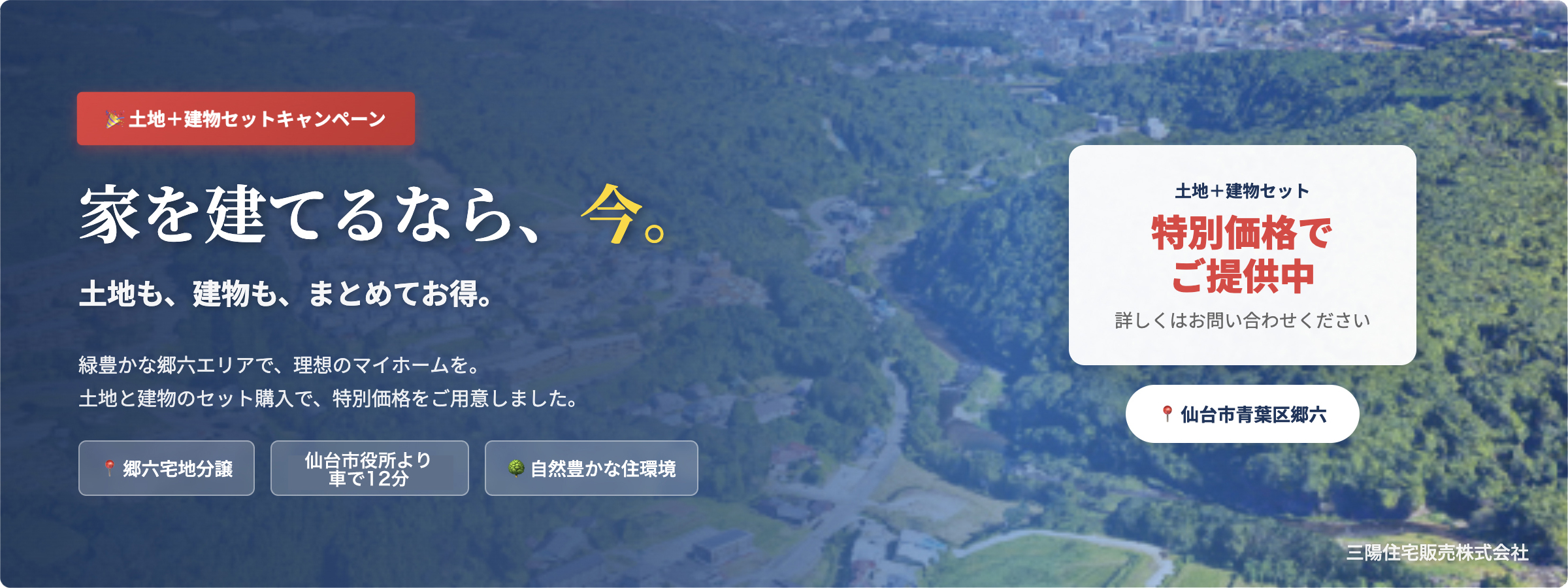 家を建てるなら、今。土地も、建物も、まとめてお得。宅地分譲。土地に建物を同時購入で土地代がお得に!